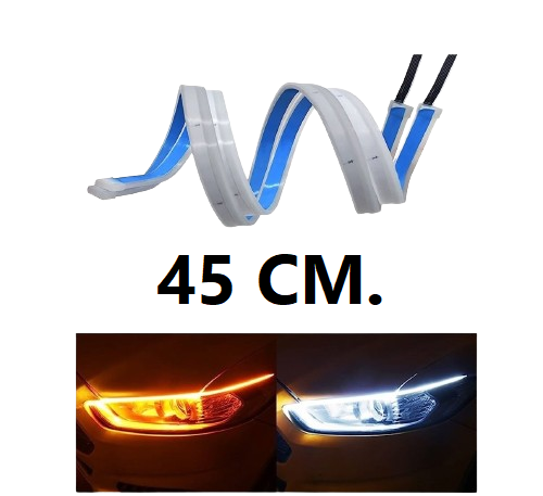 TIRAS LED DRL FLEXIBLE SLIM 45 CM BLANCA / LUZ DE GIRO NARANJA- 2 tiras de LED DRL.- Potencia: 12 W.- Flexibles.- Resistentes al agua. Precio por par- Color: Blanco/Ámbar